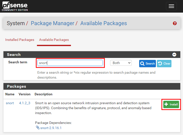 导航到系统>插件管理>可用插件,搜索snort,找到后单击右侧图标安装。