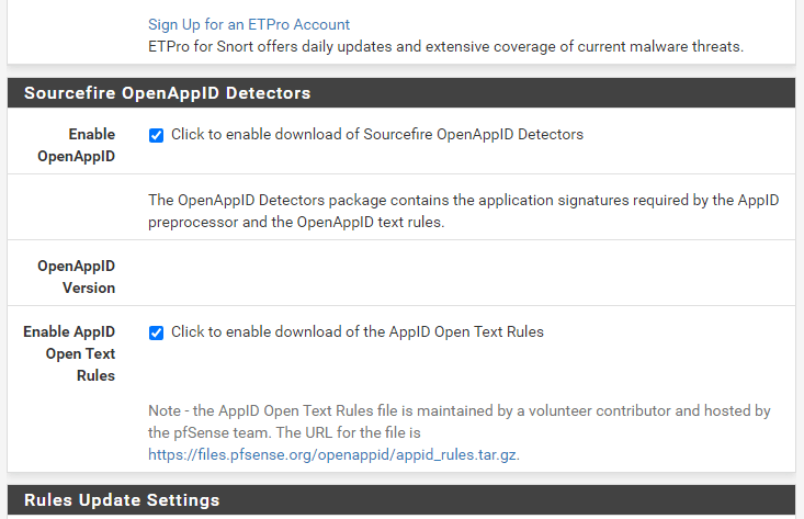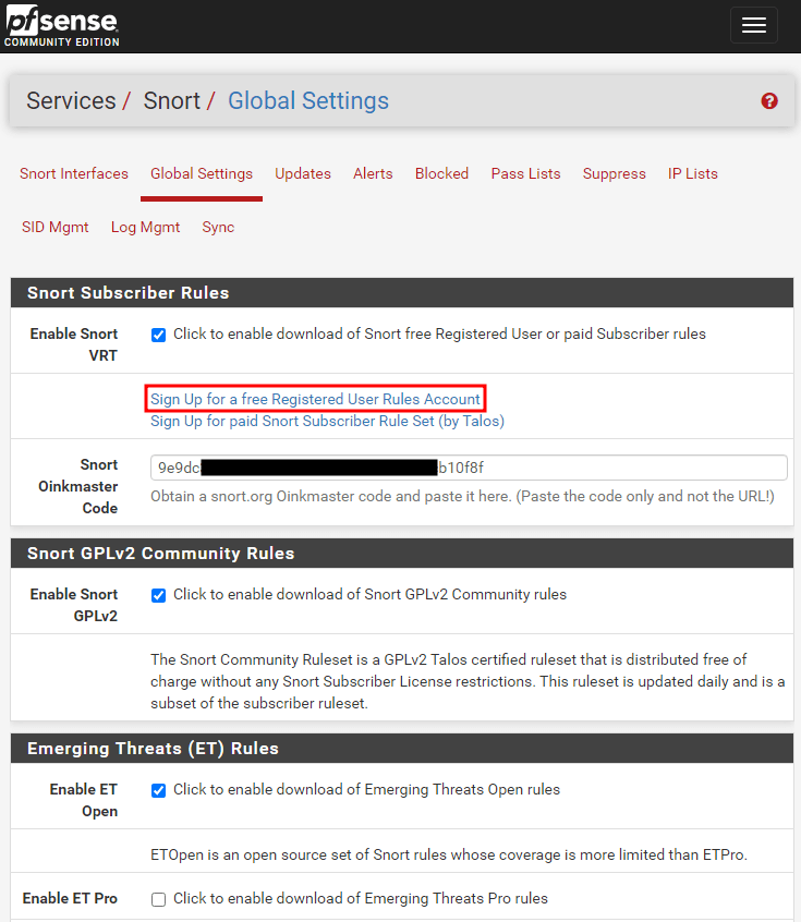 导航到服务>Snort>Global setting菜单,启用Snort VRT,创建一个免费帐户并将代码粘贴到下图所示位置,其他选项根据需要进行设置。