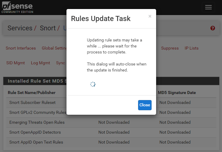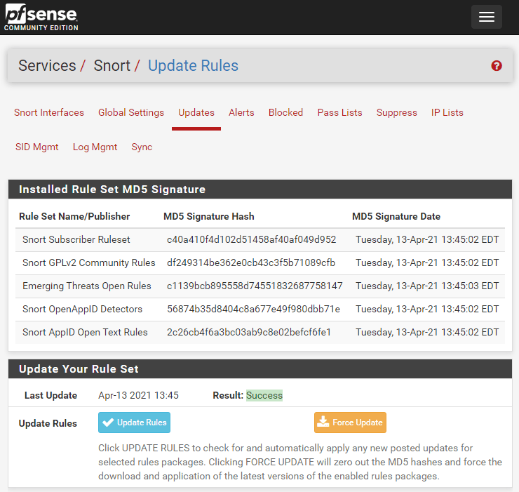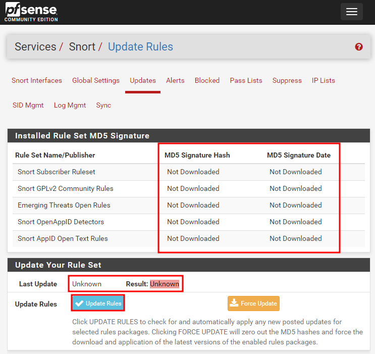 在正式使用前,建议先更新系统,更新各类列表。导航到系统>Snort>Update Rules菜单,找到Update Rules按钮并点击。