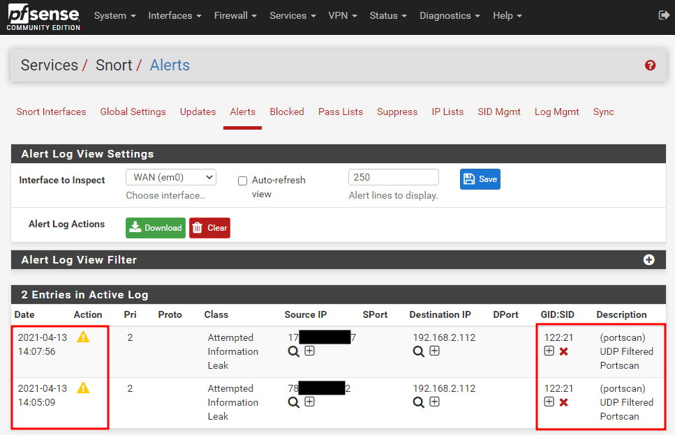 在Snort的警报菜单,查看自动触发的警报信息,并根据情况进行适当的处理。