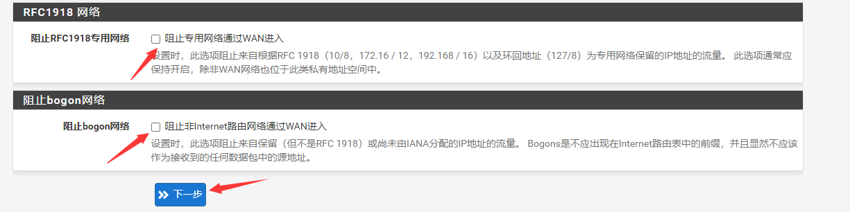 因为是二级路由,RFC1918网络和阻止bogom网络前面的勾取消掉,点击下一步。