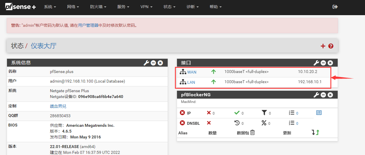 鸡哥的pfsense软路由ETH0接口默认为WAN口,ETH1接口默认为Lan口,所以我们找一台任意电脑,找一根网线连接我们的ETH1接口,连接上网线DHCP自动获取一个IP,ETH1接口默认管理地址为192.168.10.1(仅限于定制版本)。