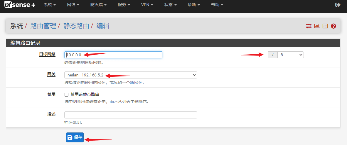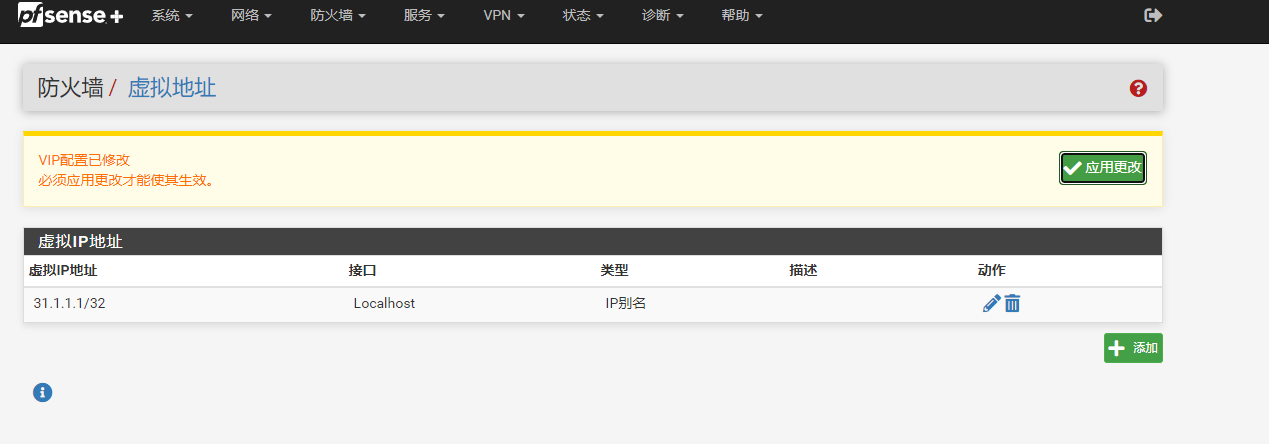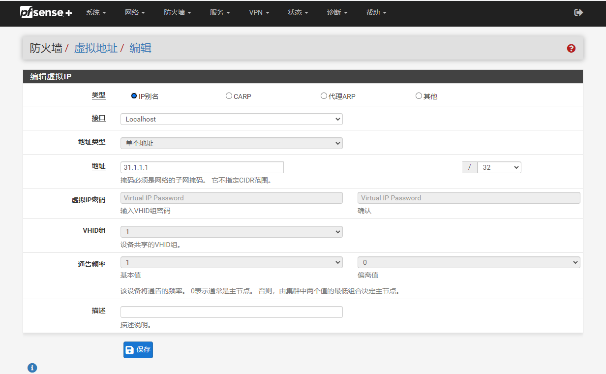 Localhost代表本地环回接口,地址为31.1.1.1/32位保存,之后使用31.1.1.1地址登陆pfsense防火墙系统。