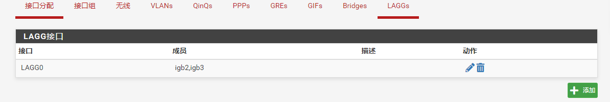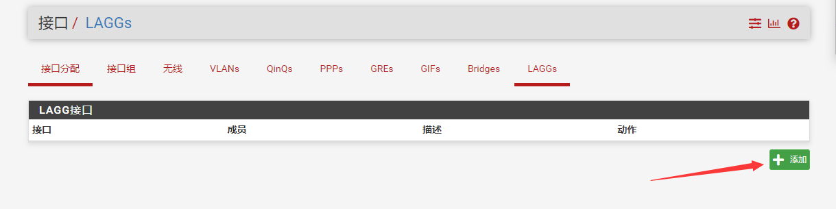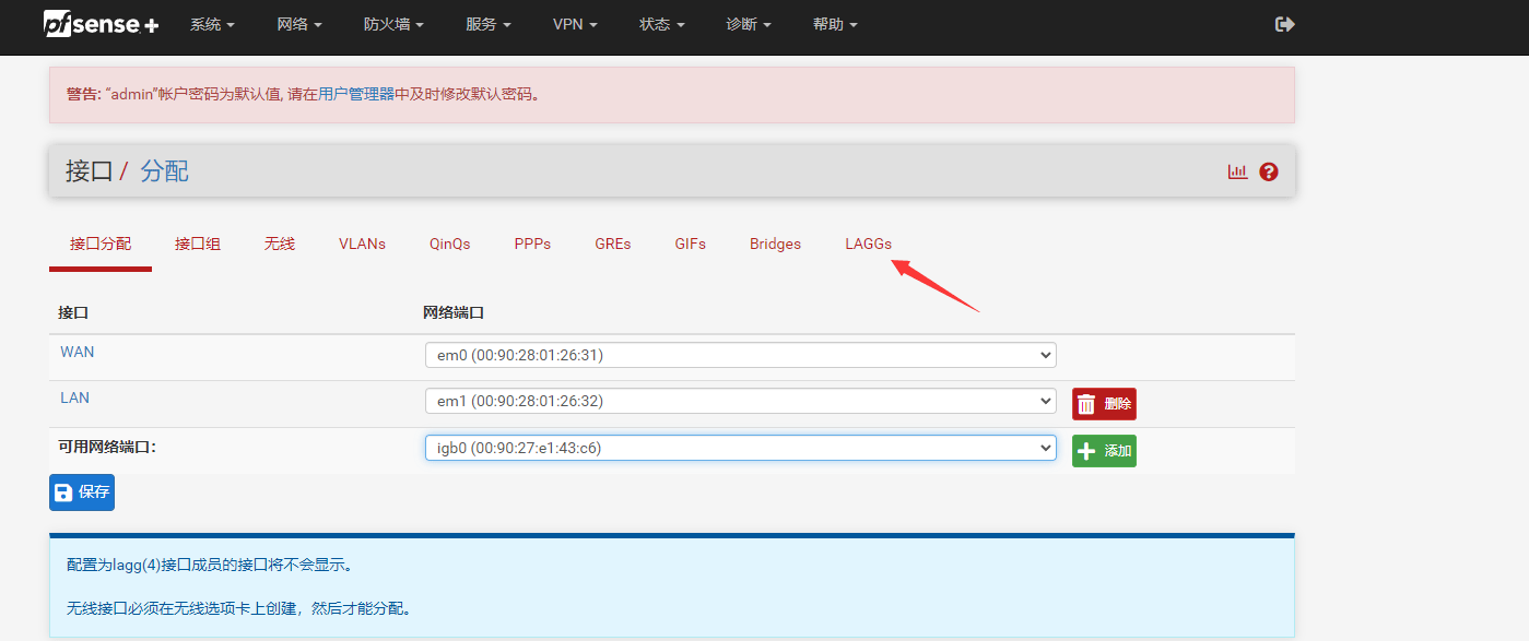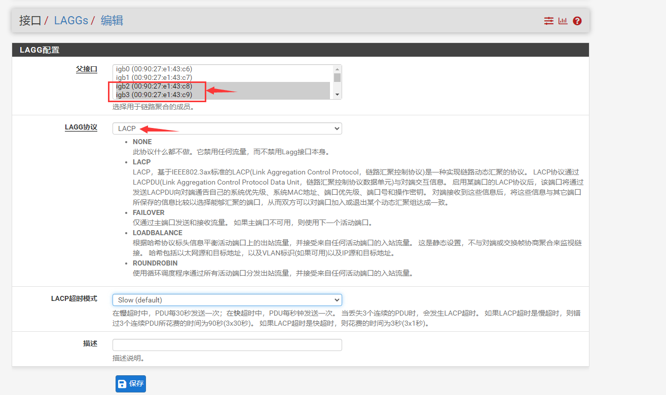 使用键盘ctrl按键+鼠标左键选中我们要链路聚合的接口即可,LAGG协议选择LACP模式,其他选项保持默认即可。