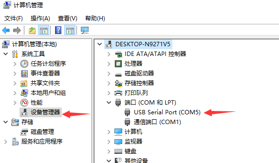 Windows系统——右键此电脑——管理——计算机管理中左侧找到设备管理器——右边找到端口——查看是否有USBSerial Port(COM5)
