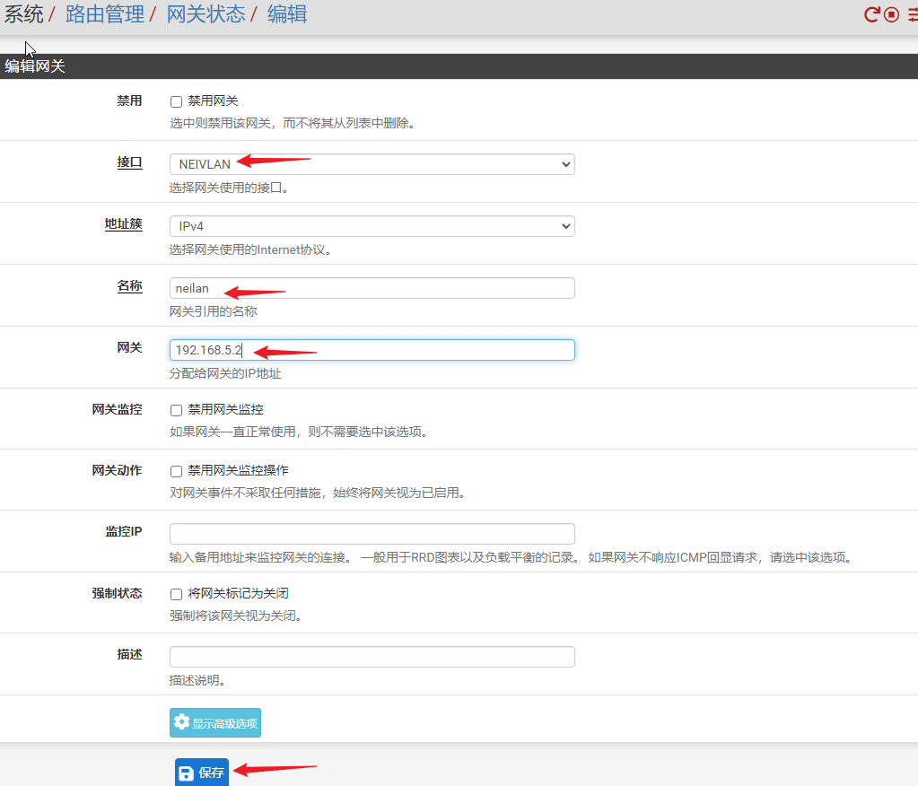 接口选择连接思科3560交换机那个口,网关填写思科3560交换机的vlan5的网关,点击保存。