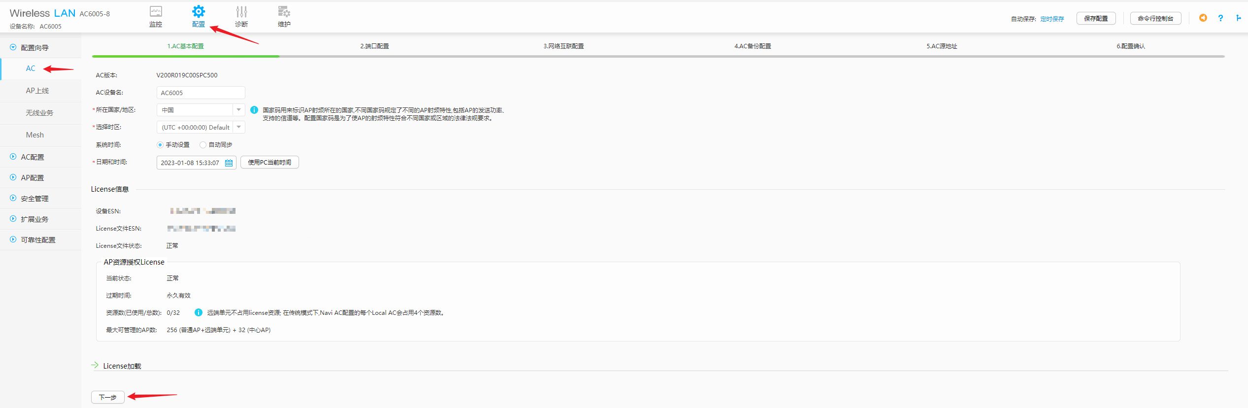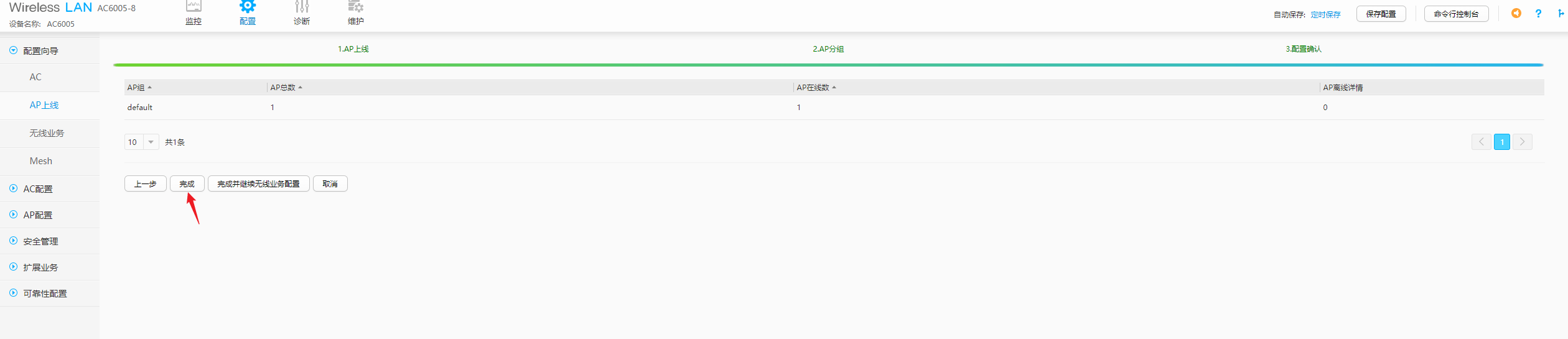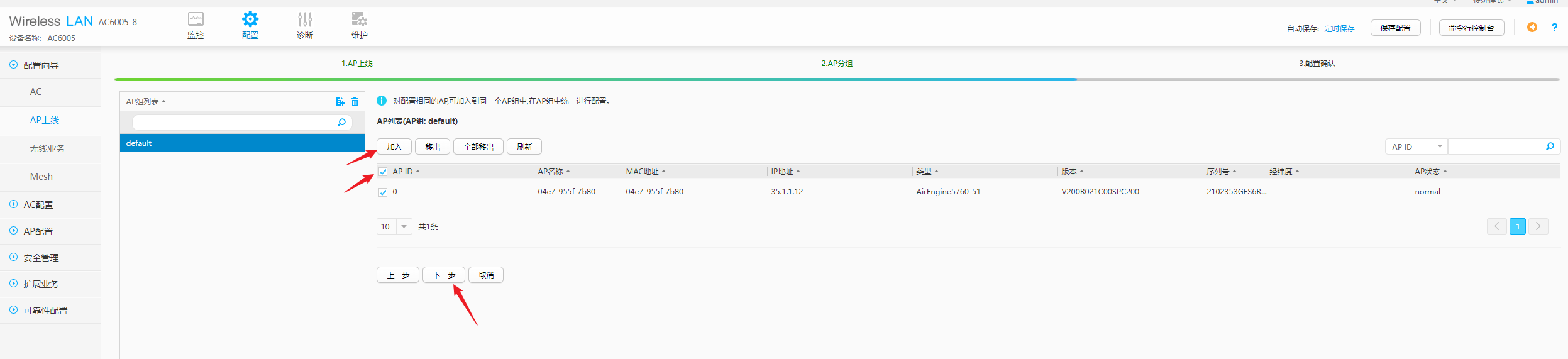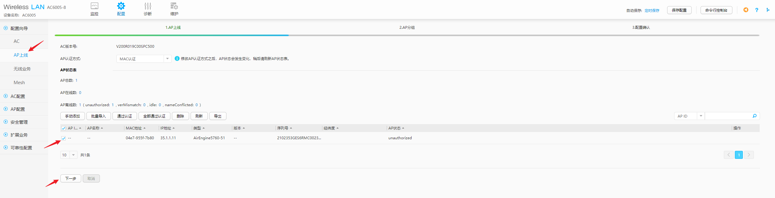 配置—ap上线—选中ap后—点击全部认证—点击下一步。