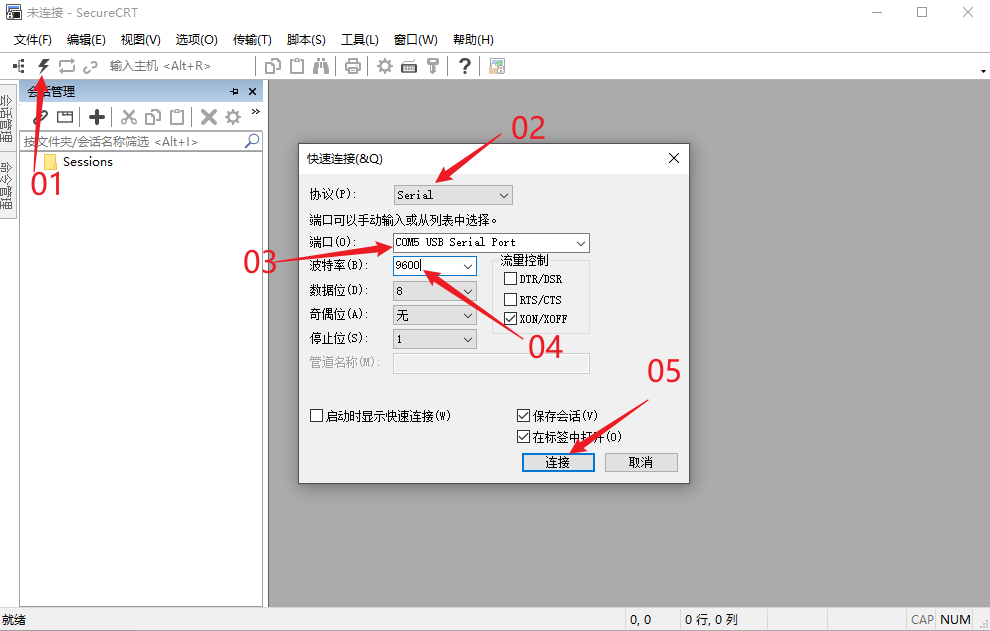 鸡哥使用securecrt软件进行连接,点击01快速连接,02协议选择serial,03选择com5usb,04选择9600,05点击连接。