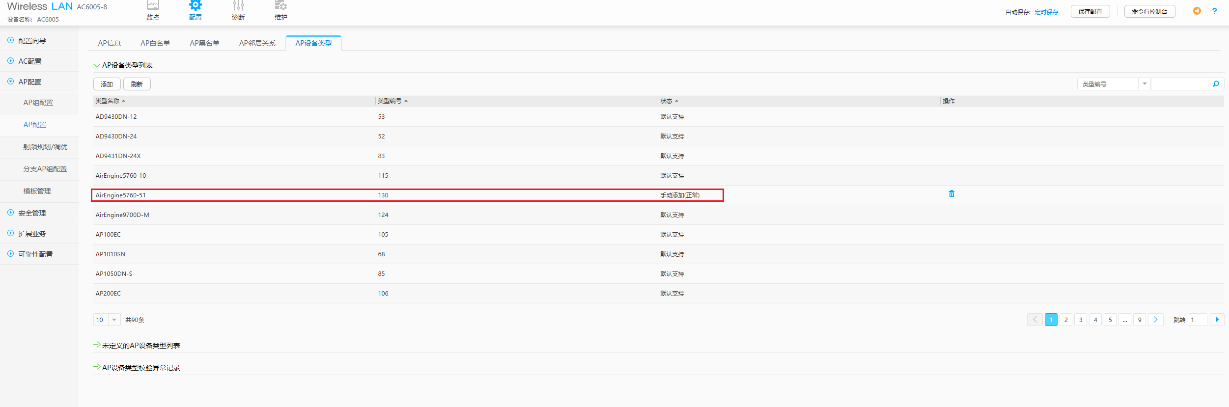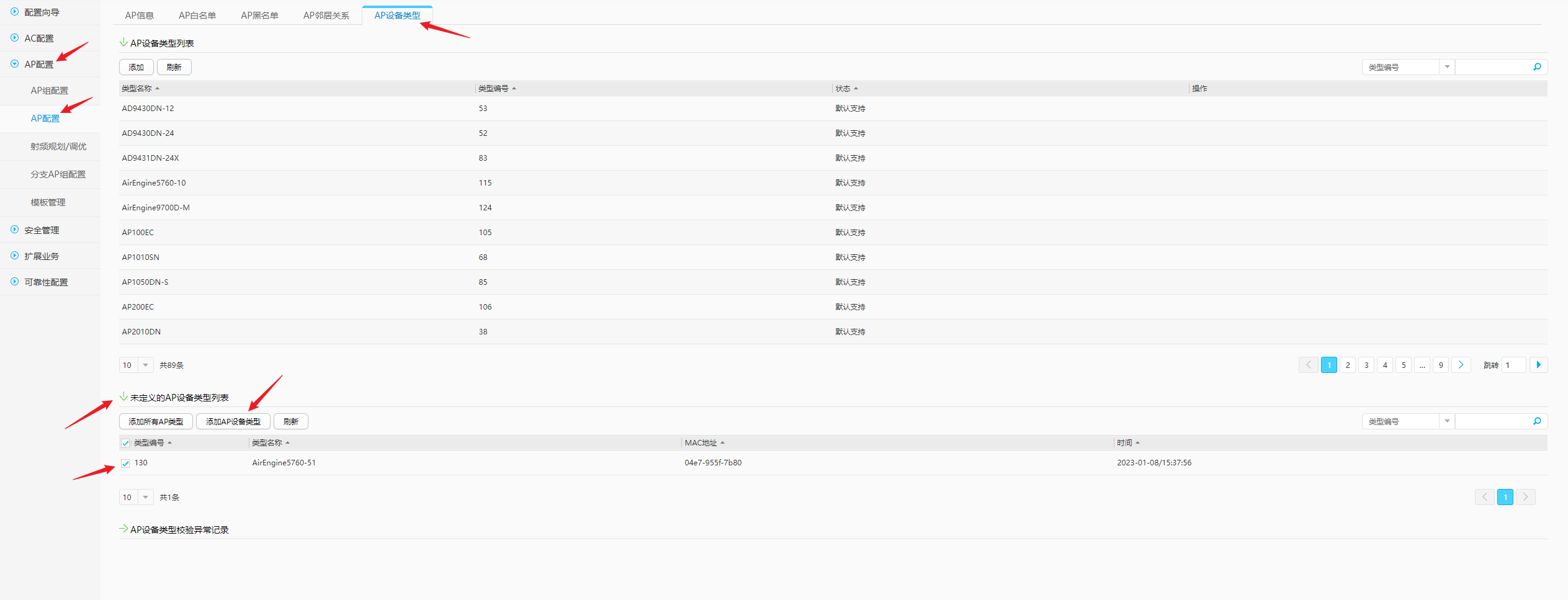 点击左侧AP配置——点击AP设备类型——点击未定义的AP设备类型列表——选中我们所需要的ap5760-51——点击添加所有AP类型