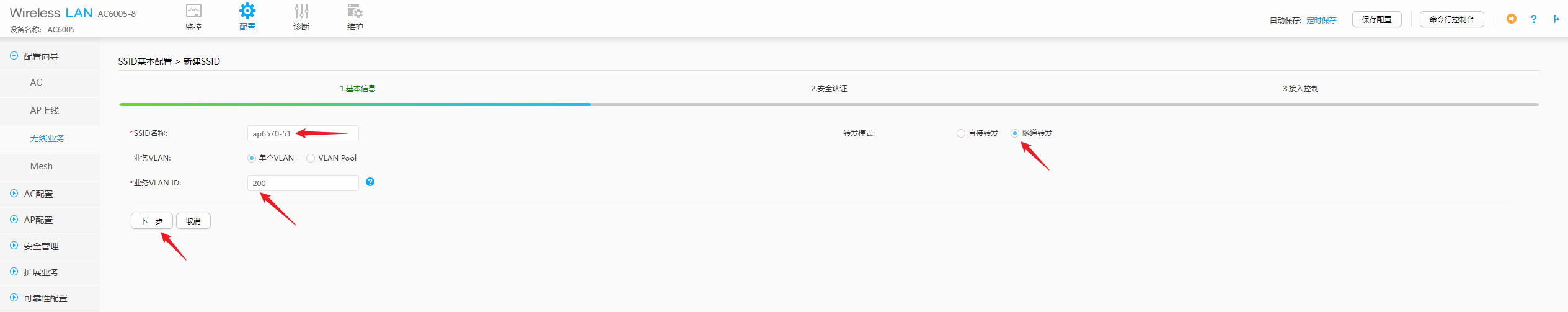 SSID名字随意—转发模式隧道模式—选择单个vlan—输入vlan编号200(拓扑规划得出)。