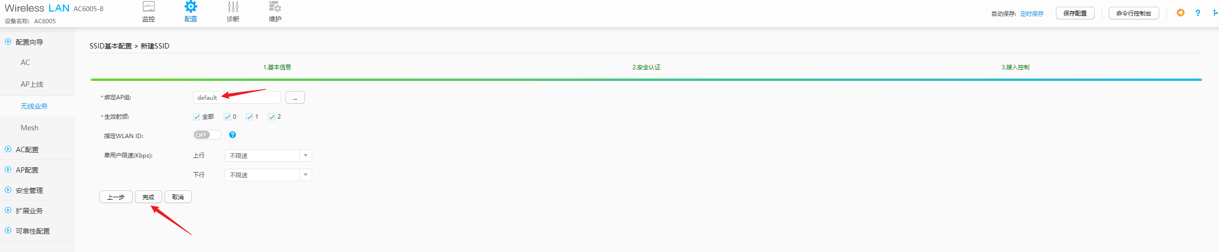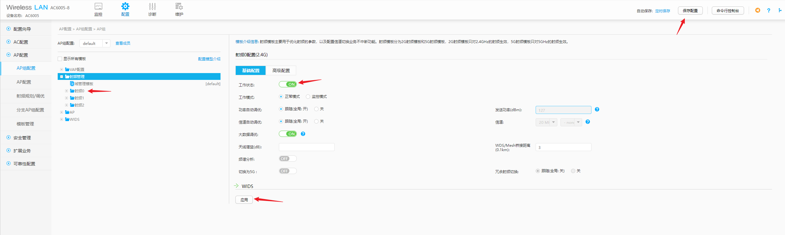 绑定ap组是策略—生效射频0.1.2分别代表2.4和5g可以关闭2.4,—点击完成。